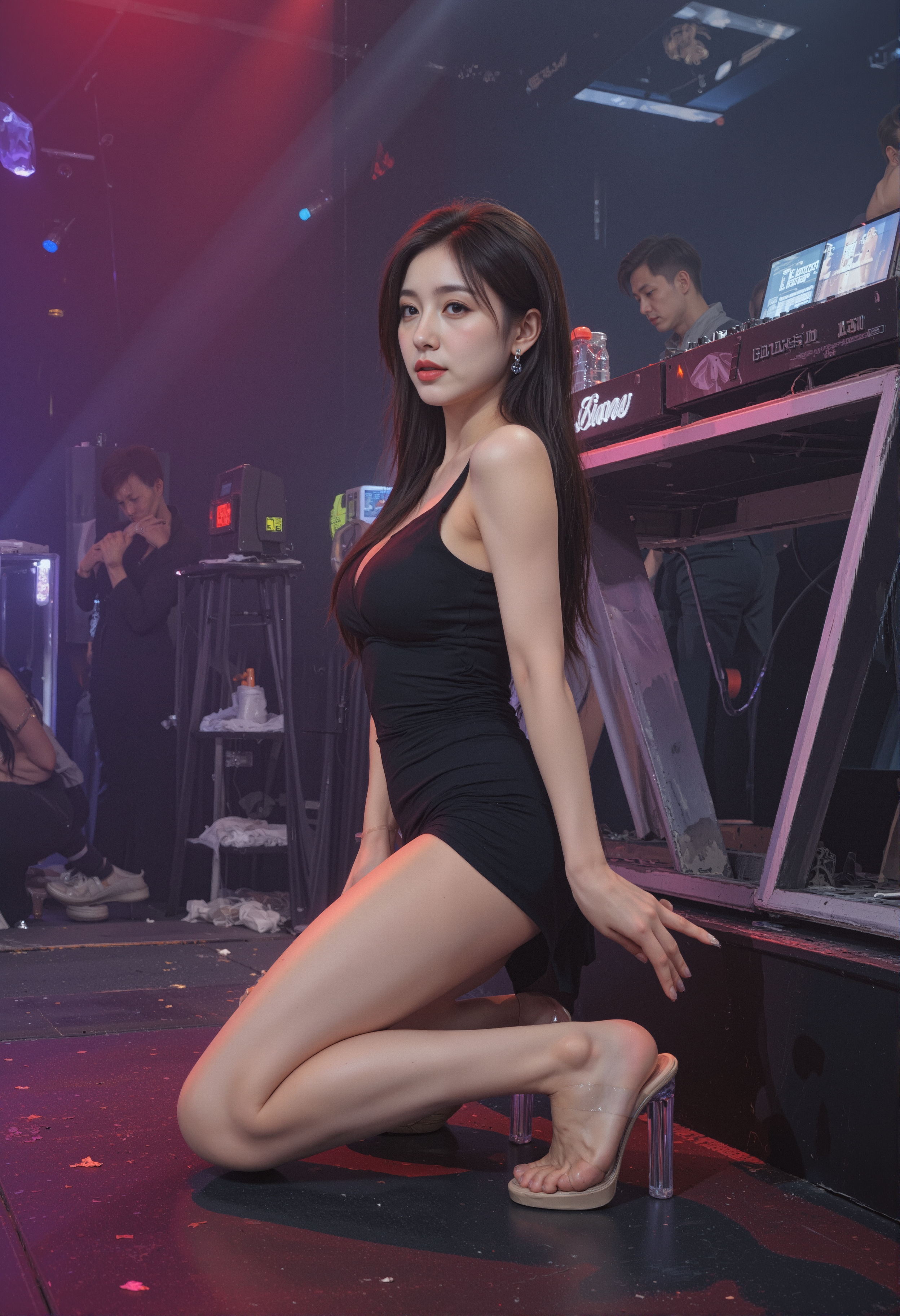 • 高台 nightclub,nigtclub's stage,stage, elevated square platform, (very high square platform:1.3),peole in background gathered ((below the elevated platform):1.4), surrounding it and ((looking at girl):1.4), at the base of the stage.nc_scene
