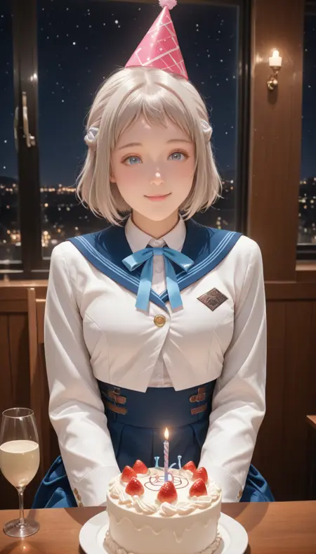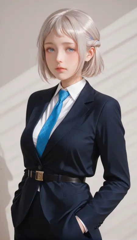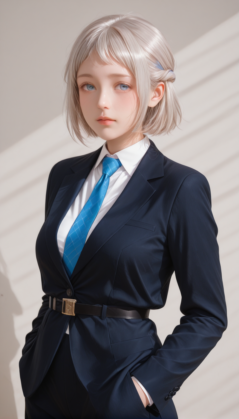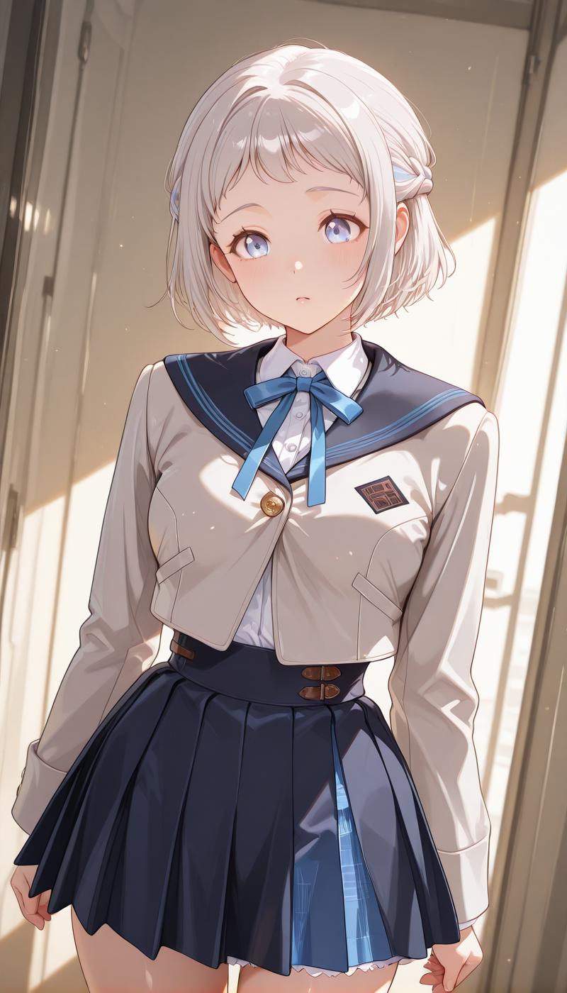 shirt, skirt, long sleeves, hair ornament, bow, ribbon, jacket, school uniform, white shirt, pleated skirt, collared shirt, hairclip, bowtie, black skirt, sailor collar, blue skirt, neck ribbon, dress shirt, white jacket, blazer, blue ribbon, black sailor collar, grey jacket, breast pocket, thighs,