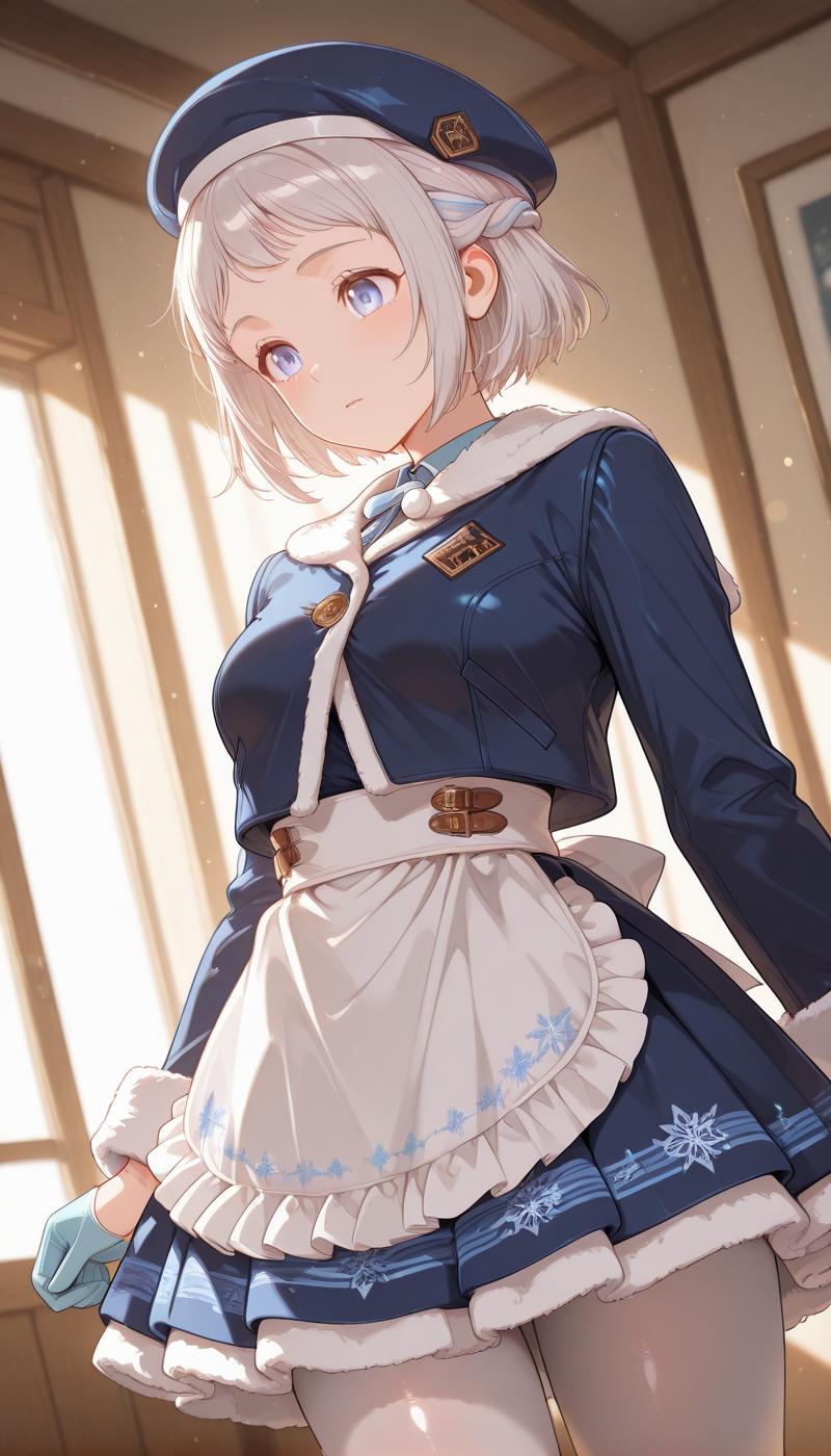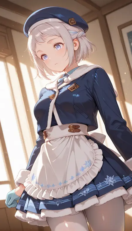 shirt, skirt, long sleeves, hair ornament, gloves, dress, hat, jacket, pantyhose, frills, white gloves, apron, blue skirt, fur trim, beret, blue jacket, white apron, waist apron, blue headwear, white pantyhose, blue gloves, fur-trimmed jacket, half gloves, fur-trimmed sleeves, fur-trimmed gloves, fur-trimmed dress, bokeh, fur-trimmed boots, snowflake print, fur-trimmed skirt, blue dress, pom pom (clothes), cropped jacket, thighs,