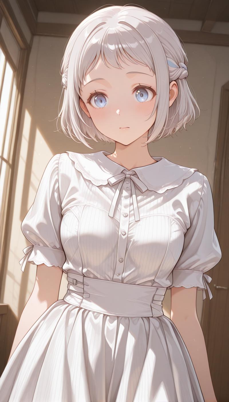 hair ornament, dress, ribbon, short sleeves, frills, puffy sleeves, white dress, striped clothes, puffy short sleeves, frilled dress, white ribbon, vertical-striped clothes, striped dress, vertical-striped dress, white bow,