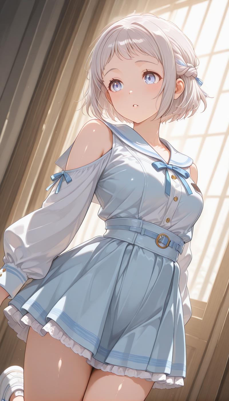 skirt, long sleeves, dress, bow, ribbon, bare shoulders, hair ribbon, hair bow, frills, sailor collar, clothing cutout, blue dress, frilled dress, blue ribbon, sneakers, shoulder cutout, white dress, thighs,