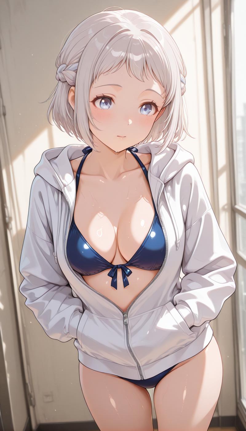 long sleeves, hair ornament, cleavage, jacket, collarbone, swimsuit, bikini, hood, hoodie, white jacket, hood down, hooded jacket, front-tie top, bikini top only, blue bikini, zipper, front-tie bikini top, bikini under clothes, unzipped, white hoodie, partially unzipped, drawstring, thighs,