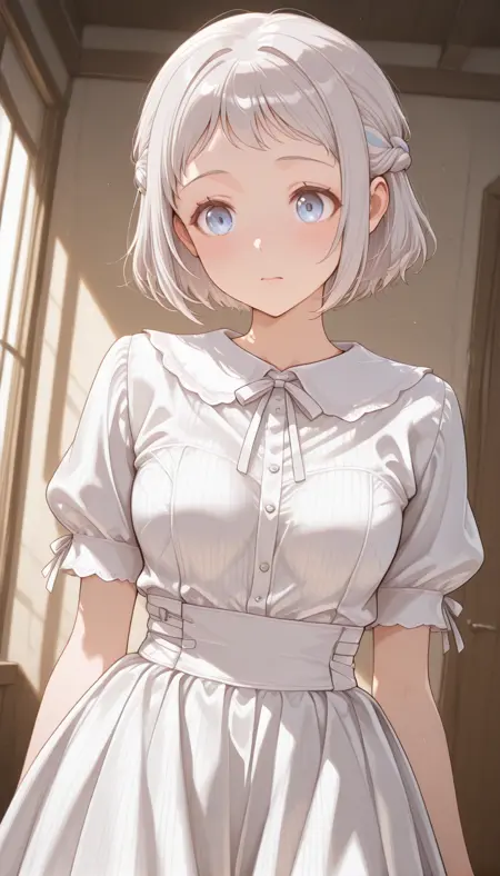 IMKatsuLilja, breasts, short hair, blue eyes, white hair, grey hair, braid, sidelocks, blue hair, multicolored hair, french braid, short bangs, medium breasts, small breasts,
