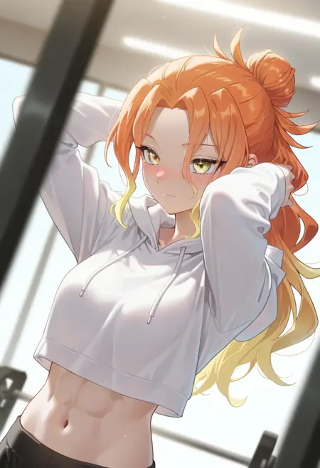 她的外貌标签: 1girl, solo, 长发, 金发, 发丝遮眼, 中等胸部, 黄色眼睛, 多色头发, 侧发, 橙色头发, 分开的刘海, 渐变发色, 单发髻, 杂色发丝, 波浪发, 高马尾,