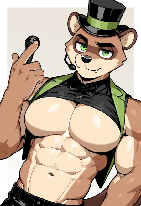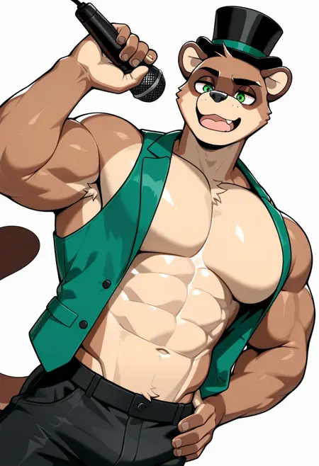 Perfect eyes, Perfect face, Perfect anatomy, Furry, anthro, solo, male, weasel, Green eyes, black top-hat, beige body, tan stomach, Brown weasel tail, beige mouth, brown eyeshadow, Brown ears, beige inners ears, fang, black eyebrows, black nose, close mouth
