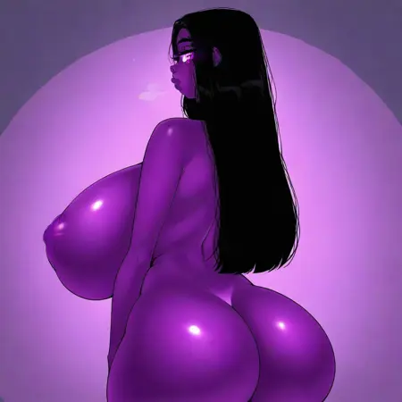 long hair, black hair, purple skin, purple eyes, naked, purple nipples, thick lips,