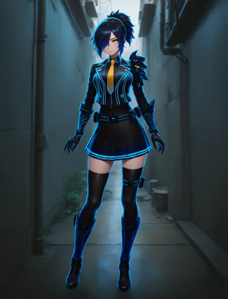 例:Neowave、黄色い目、髪が目を覆う、ポニーテール。