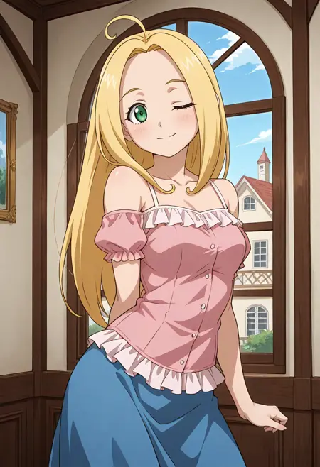 服装例:ピンクのシャツ、青いロングスカート、肩出し