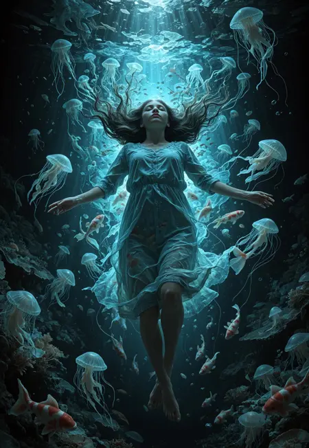 Undwatmb2, underwater scene, floating underwater, dreamy atmosphere, ethereal glow, jellyfish, koi fish, flowing clothes, wet clothes,