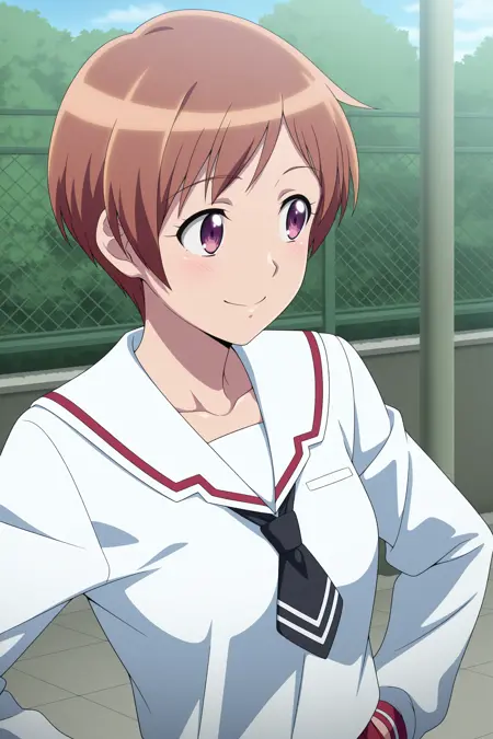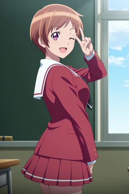 ogawa makoto, 短发, 棕色头发, 分开的刘海, 紫色眼睛, 长袖, 红色夹克, 白色衬衫, 白色水手领, 黑色领带, 短领带, 红色裙子, 百褶裙, 条纹裙, 白色袜子, 过膝袜, 棕色鞋子, 乐福鞋