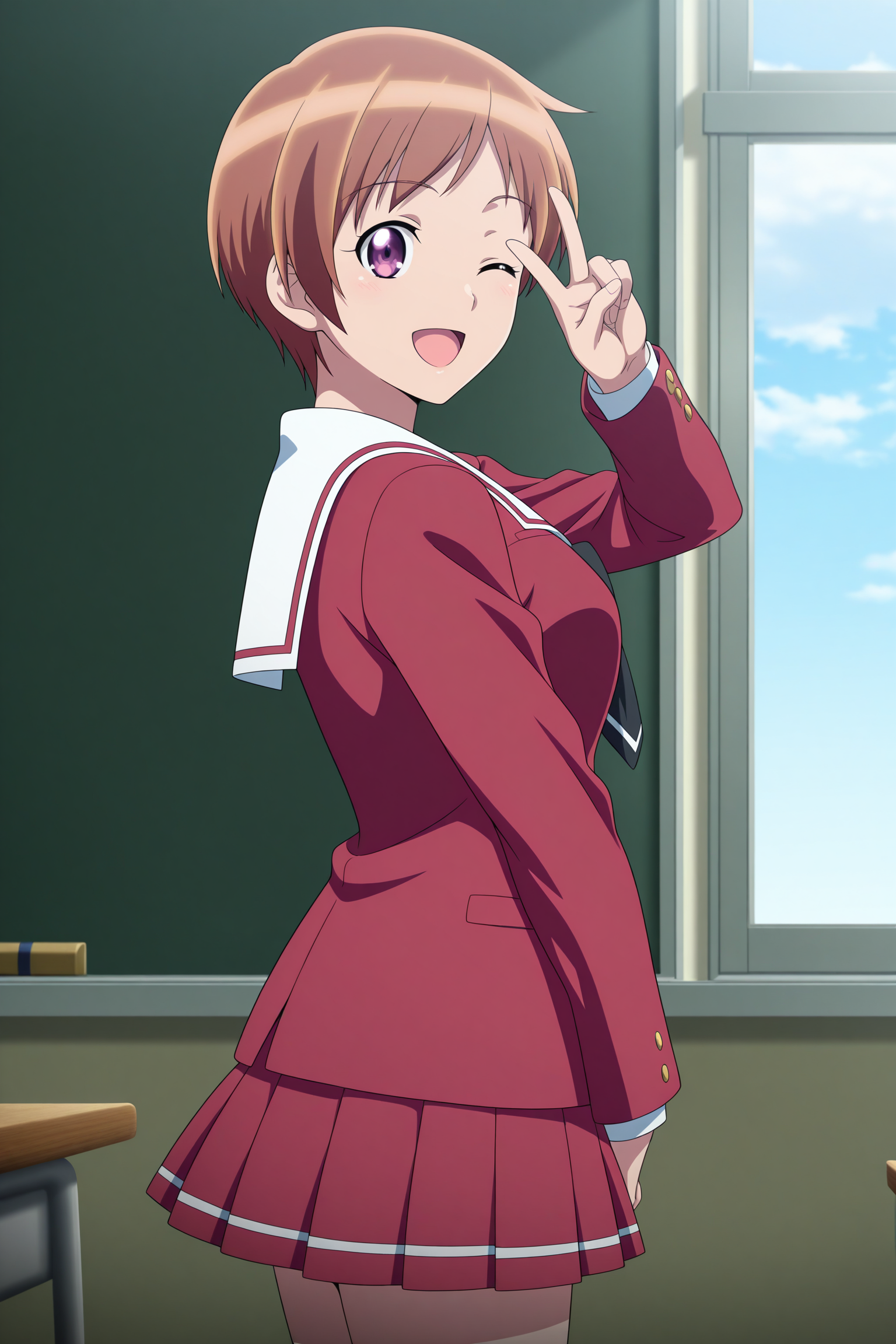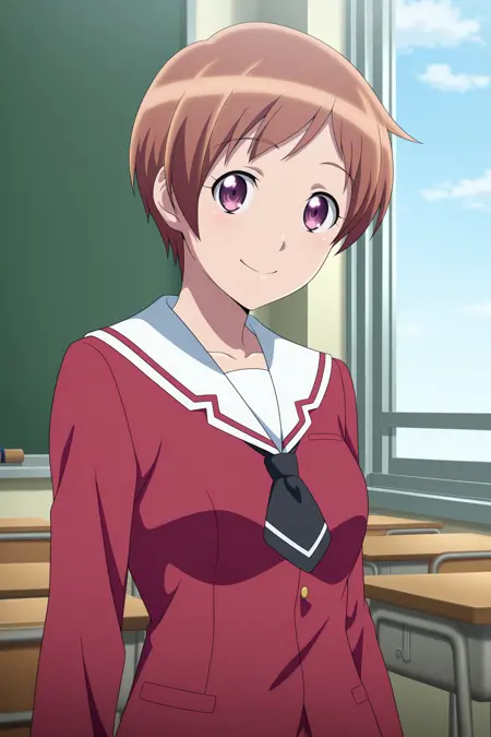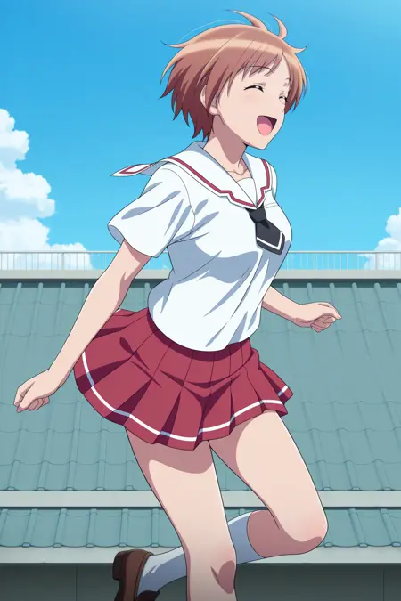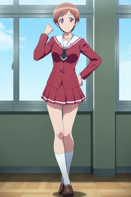 ogawa makoto, short hair, brown hair, parted bangs, purple eyes, long sleeves, red jacket, white shirt, white sailor collar, black necktie, short necktie, red skirt, pleated skirt, striped skirt, white socks, kneehighs, brown footwear, loafers