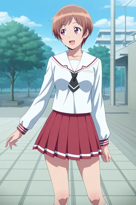 ogawa makoto, short hair, brown hair, parted bangs, purple eyes, long sleeves, white shirt, white sailor collar, black necktie, short necktie, red skirt, pleated skirt, striped skirt, white socks, kneehighs, brown footwear, loafers