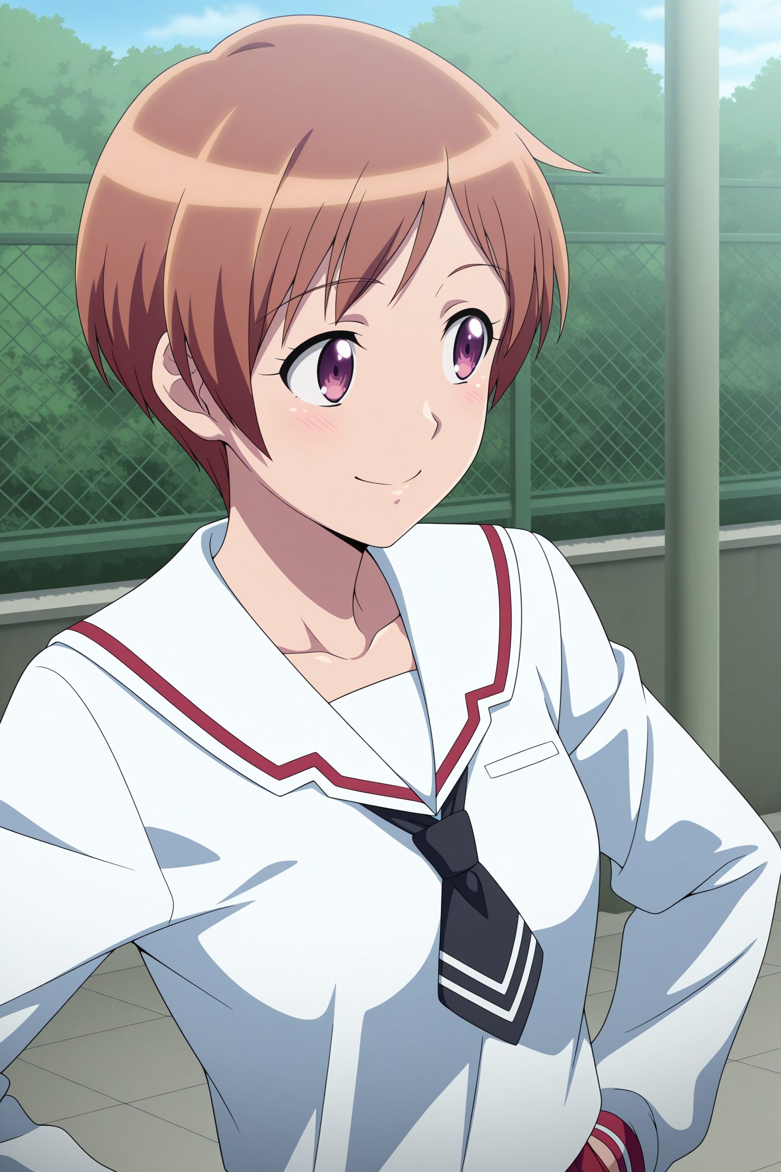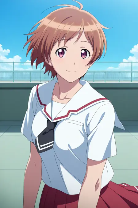 ogawa makoto, short hair, brown hair, parted bangs, purple eyes, short sleeves, white shirt, white sailor collar, black necktie, short necktie, red skirt, pleated skirt, striped skirt, white socks, kneehighs, brown footwear, loafers