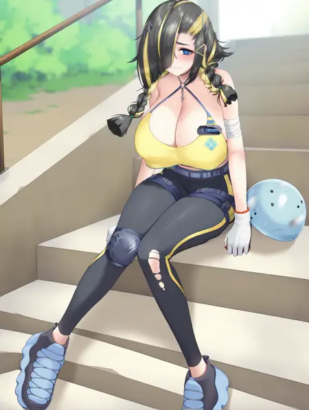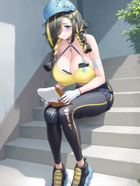 붕대, 붕대 감은 팔, 찢어진 옷, 파란 헬멧, 흰 장갑, 반창고, 신발, 단일 스트라이프, 단일 스트라이프 바지, O링, 노란 O링 상의, 어깨 드러남, 견갑골, 이름표, 복부, 초크 목걸이, 열쇠 목걸이, 검은 바지, 허벅지 스트랩