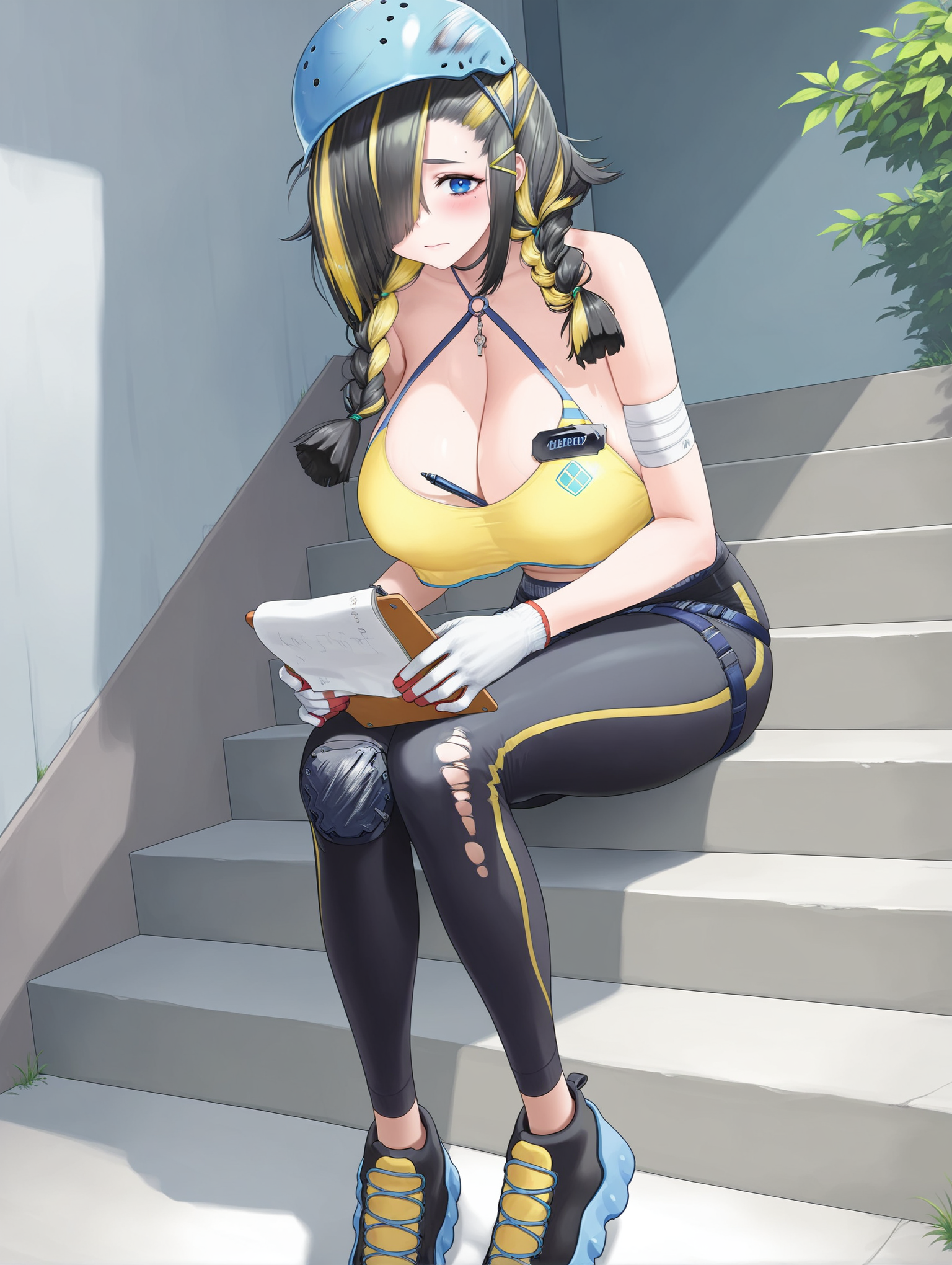 绷带,绷带手臂,破烂衣物,蓝色头盔,白色手套,创可贴,鞋履,单条纹,单条纹裤子,O型环,黄色O型环上衣,裸露肩膀,锁骨,姓名标签,腹部,项圈,钥匙项链,黑色裤子,大腿绑带