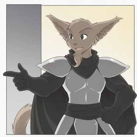 Tags to create: pauldron, cape, armor, basitin, anthro, goatee, black eyes, feline tail,