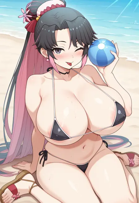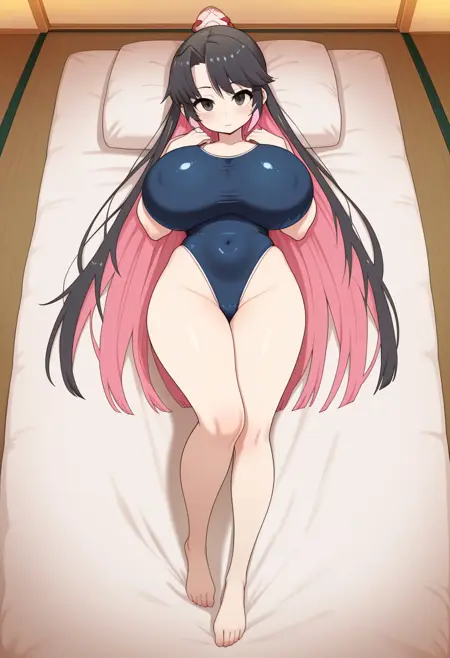1girl, long hair, black hair, pink hair, very long hair, multicolored hair, long ponytail/drill tails, two-tone hair, huge breasts, black eyes