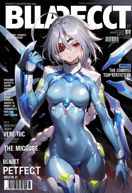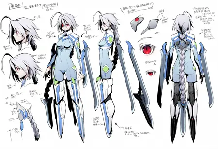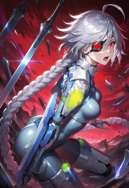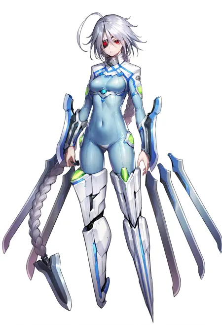 戦闘中の衣装: 編み髪、非常に長い髪、メカ娘、ボディスーツ、股部分のプレート、胸、メカニカルな翼、おへそが隠されている、剣、鎧、中程度の胸、肌にフィット、大きなアホ毛、腕のブレード