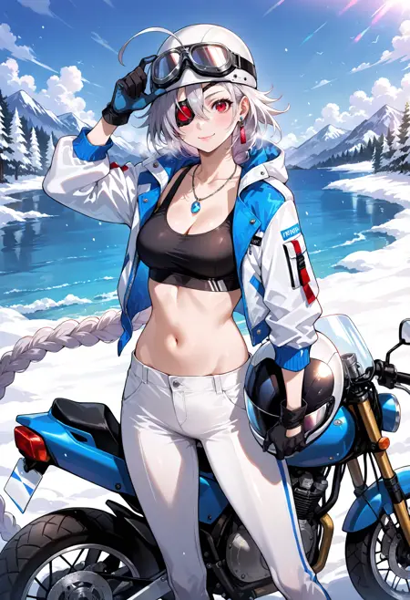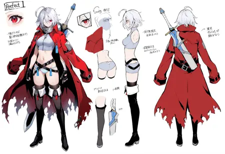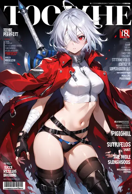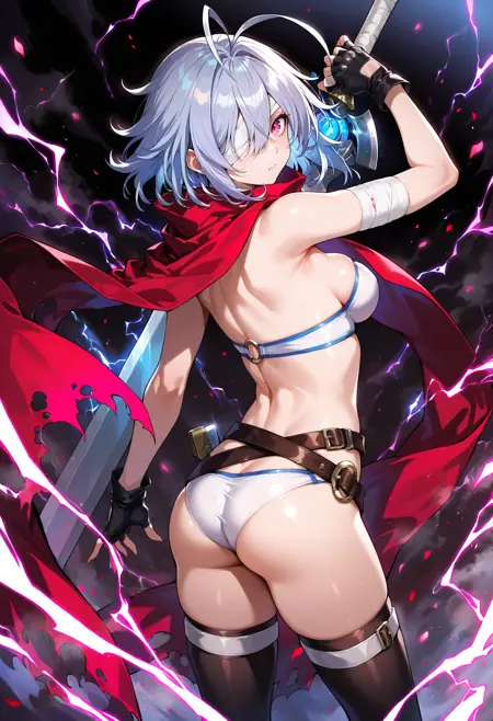 Juusan衣装(新しい外見付き): 1人の少女、赤い目、アホ毛、灰色の髪、眉間の髪、前髪、短い髪、白い髪、太ももハイ、片目を包帯で覆う、手袋、胸、指なし手袋、ベルト、包帯、破れた服、ブーツ、太ももブーツ、黒い手袋、赤いコート、赤いジャケット、黒い靴、中程度の胸、コート、バックル、ジャケット、腹部、肩にかけるジャケット、複数のベルト、ベルトのバックル、黒い太ももハイ、クロップトップ、開いたコート、開いた服、パンツ、下着、マント、ジッパー、破れた、包帯を巻いた腕、黒いベルト、ジッパーの引き手、股間、肩にかけるコート、破れたマント、剣、背中に装備された武器
