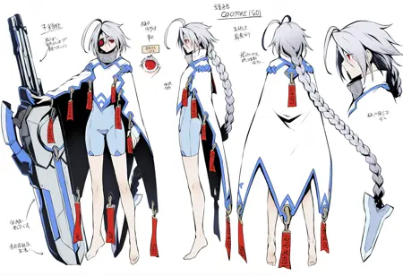戦闘前の衣装: 大きなアホ毛、編み髪、非常に長い髪、ボディスーツ、マント、裸足、メカ娘、股部分のプレート、巨大な武器