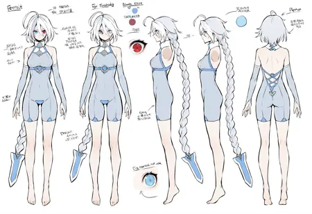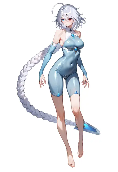 テスト衣装(外見付き): 1人の少女、アホ毛、長い髪、赤い目、灰色の髪、単一の編み髪、股部分のプレート、編み髪、ボディスーツ、裸足、ブライダルガントレット、非常に長い髪、青い目、胸、白い髪、裸の肩、異色瞳