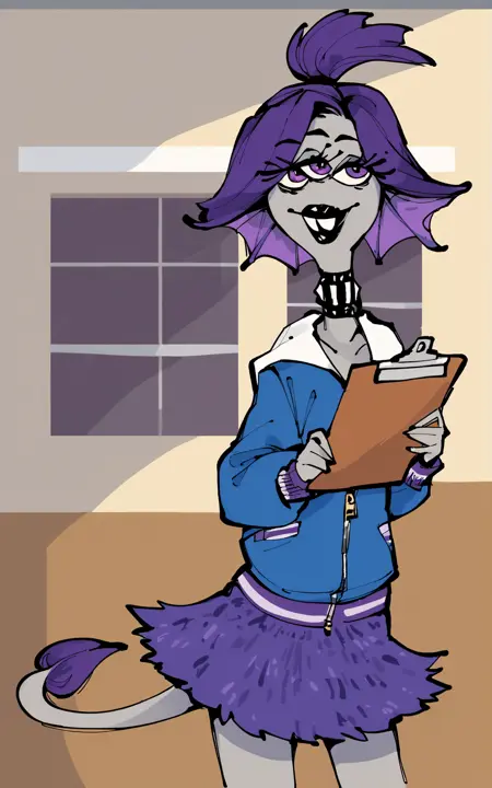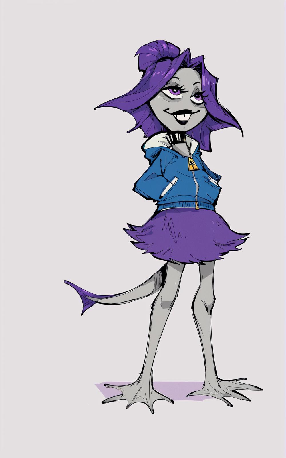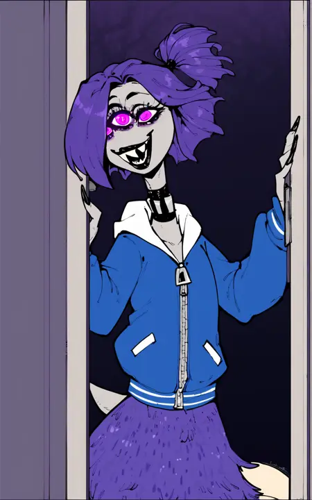 **Reinforcement Tags: **webbed feet, animal feet, purple hair, grey skin, buck teeth, ponytail, short hair, black lips, tail, purple eyes,three eyes, multiple eyes
