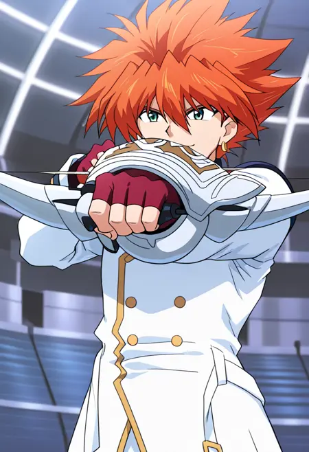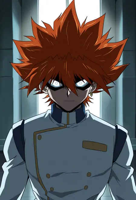 Base Form: Brooklyn, Orange Hair, Green Eyes, Spiked Hair, Hair Between Eyes, Single Earring, Red Gloves, Fingerless Gloves, White Uniform, White Pants, Brown Shoes