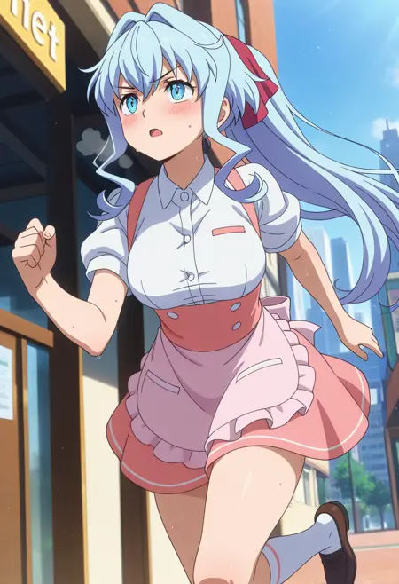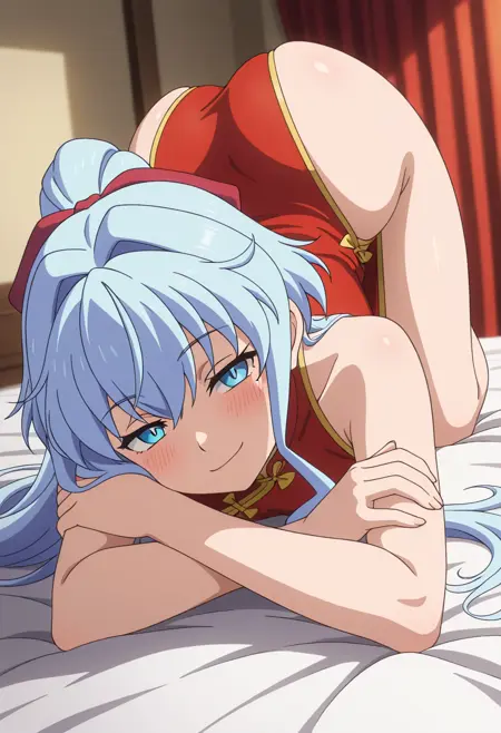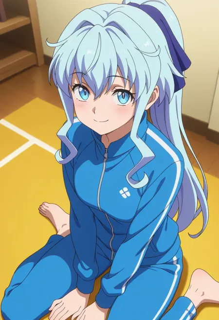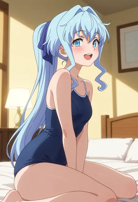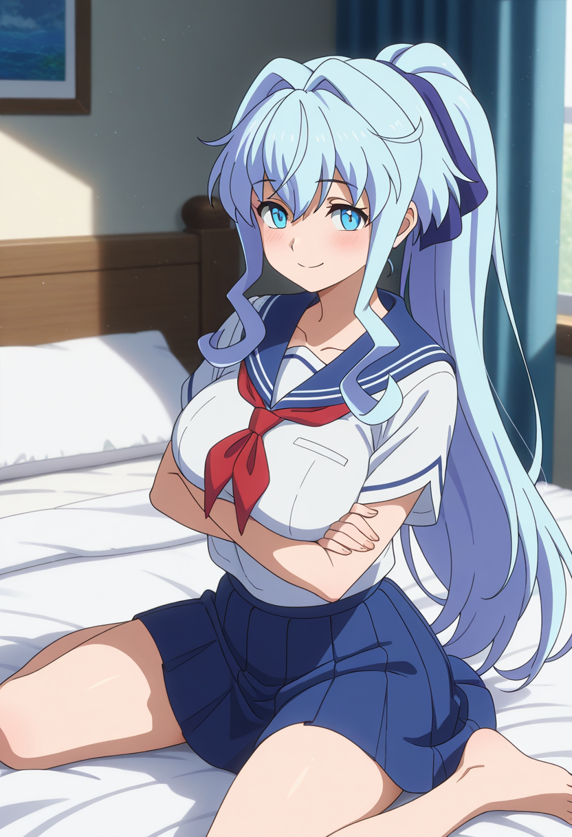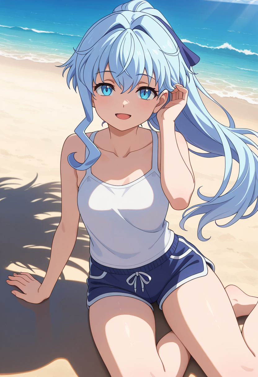 - sarareww, 蓝眼睛, 浅蓝色头发, 长发, 发丝飘动, 马尾, 蓝色发带