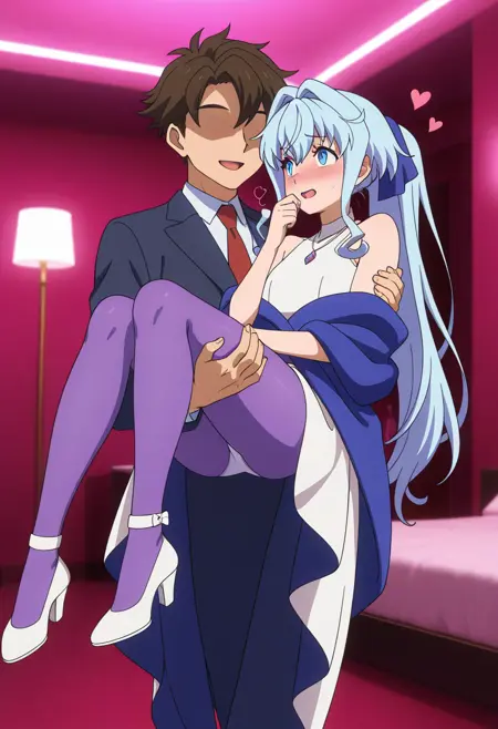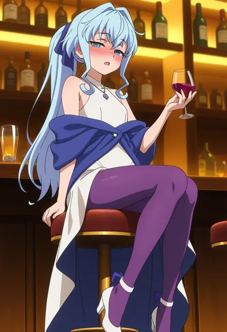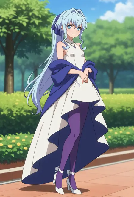 - 项链, 白色高低裙, 无袖, 蓝色披肩, 紫色连裤袜, 白色鞋履, 高跟鞋