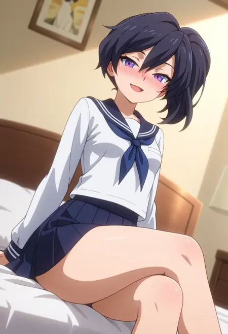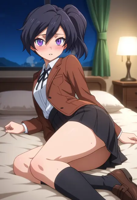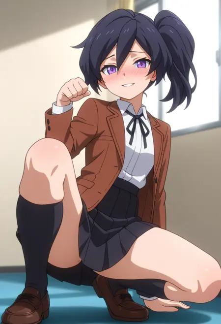 - ayaww, 紫の目, 黒髪, 横ポニーテール, 目の間の髪, 小さな胸,