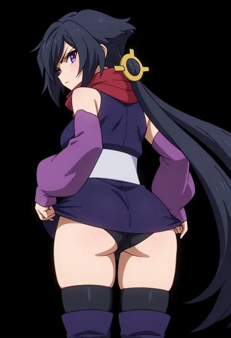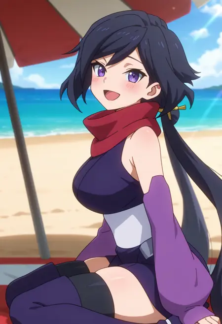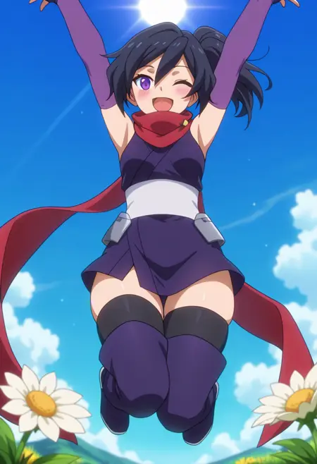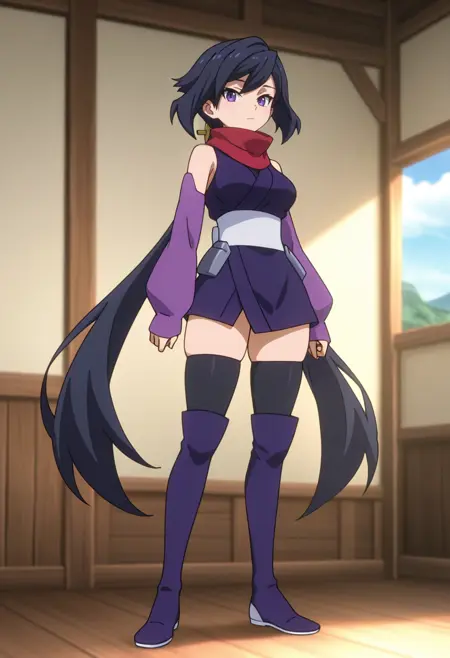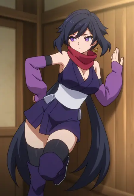 - 忍者, 赤いスカーフ, サイドレスの着物, 紫の短い着物, 外側の袖, ボリュームのある長い袖, 袖が手首より長い, ブーツの下の太ももハイ, 絶対領域, 黒の太ももハイ, 紫の太ももブーツ,