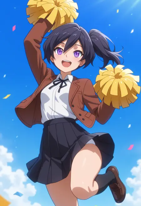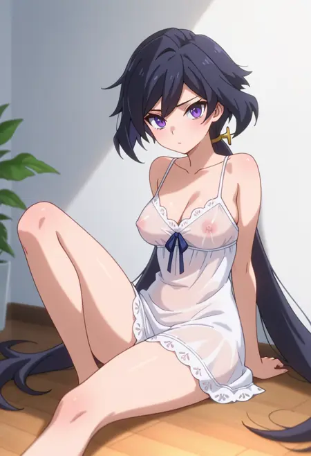 - ayameww, 紫の目, 黒髪, 長い髪, 非常に長い髪, 分かれたポニーテール, 低めのポニーテール, 前髪, 髪飾り, 中程度の胸,