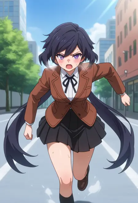- 制服, 黒いネックリボン, ブレザー, 茶色のジャケット, 白いシャツ, 長袖, 黒いプリーツスカート, ウエスト高めのスカート, 黒の膝丈ストッキング, ローファー,