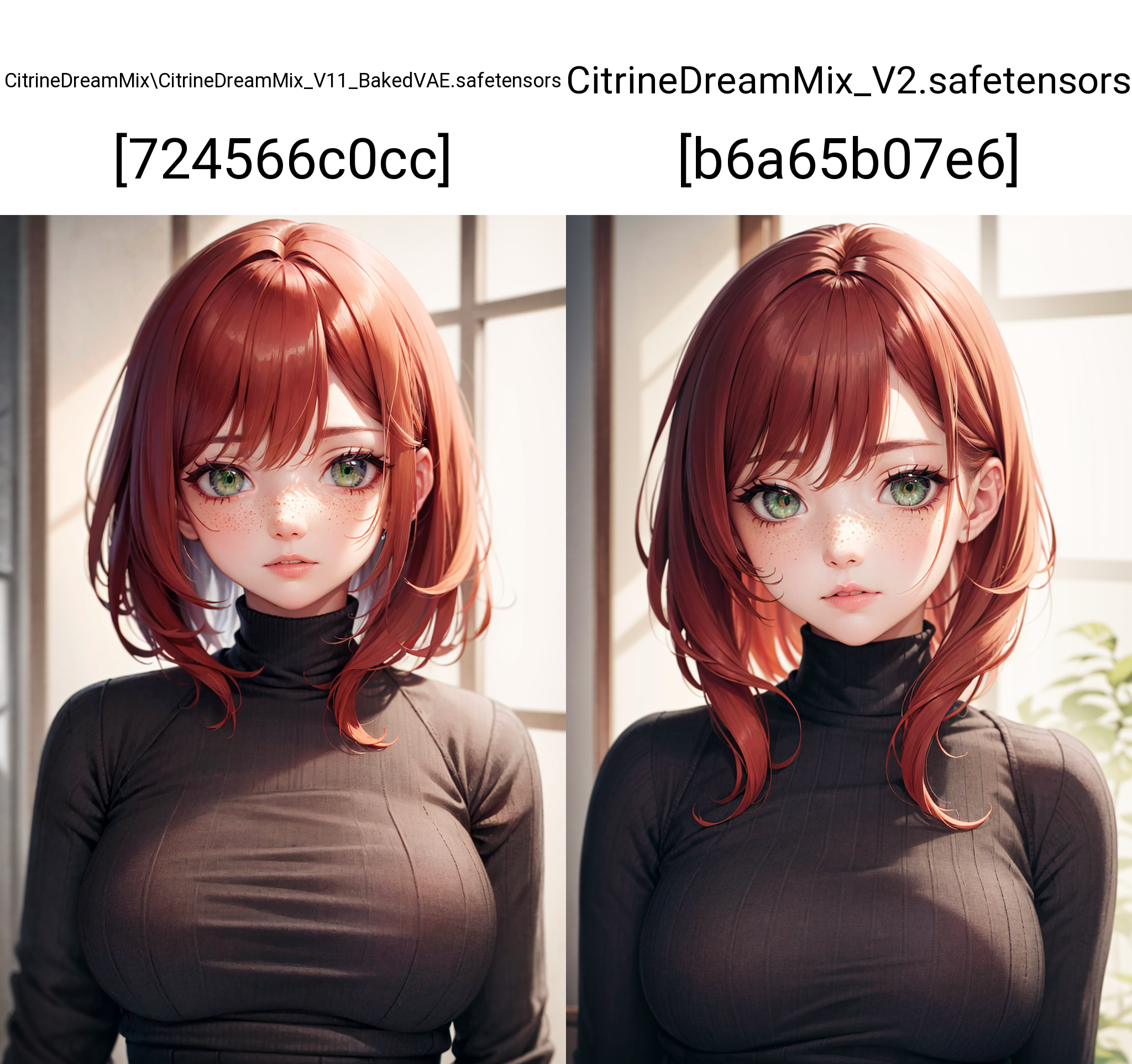 以下に、CitrineDreamMix と AOM3、NED のスタイルの違いを示す例として画像を挙げています。さらに、例の画像にはより大きなサイズでの比較も含まれています。いずれのモデルもプロンプトキーワードでリアル志向やアニメ風に調整可能なので、シンプルなプロンプトにして、それぞれの通常のスタイルの違いを見せています。すべてのモデルは美しい画像を生成するため、好みや題材に基づく選択になるだけです。