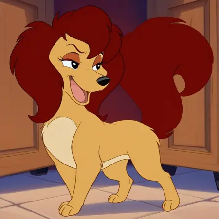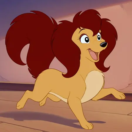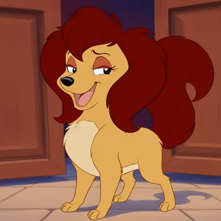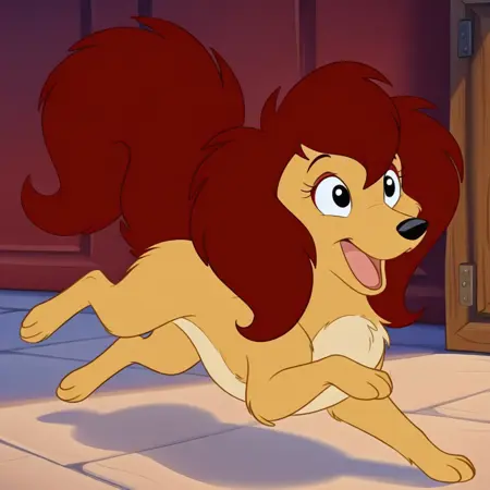 bess, female, dog, disney, golden yellow fur, light beige belly, reddish brown hair, reddish brown tail, reddish brown eyeshadow, black eyes