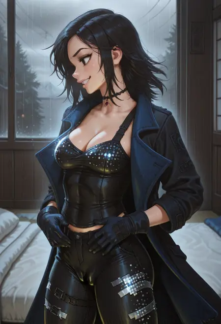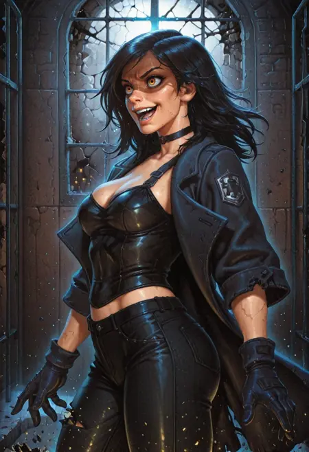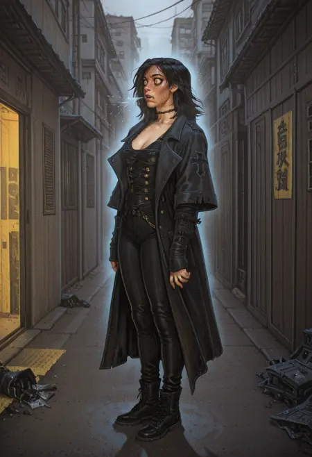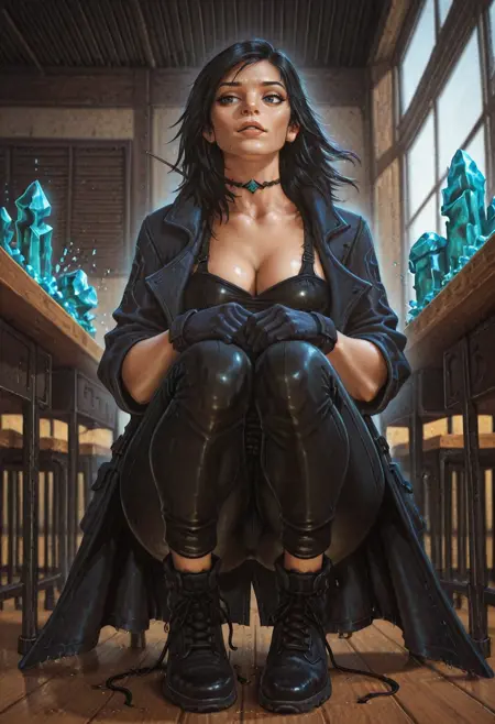 choke, 장갑, 긴 재킷, 검은 바지, 검은 상의강도: 0.7