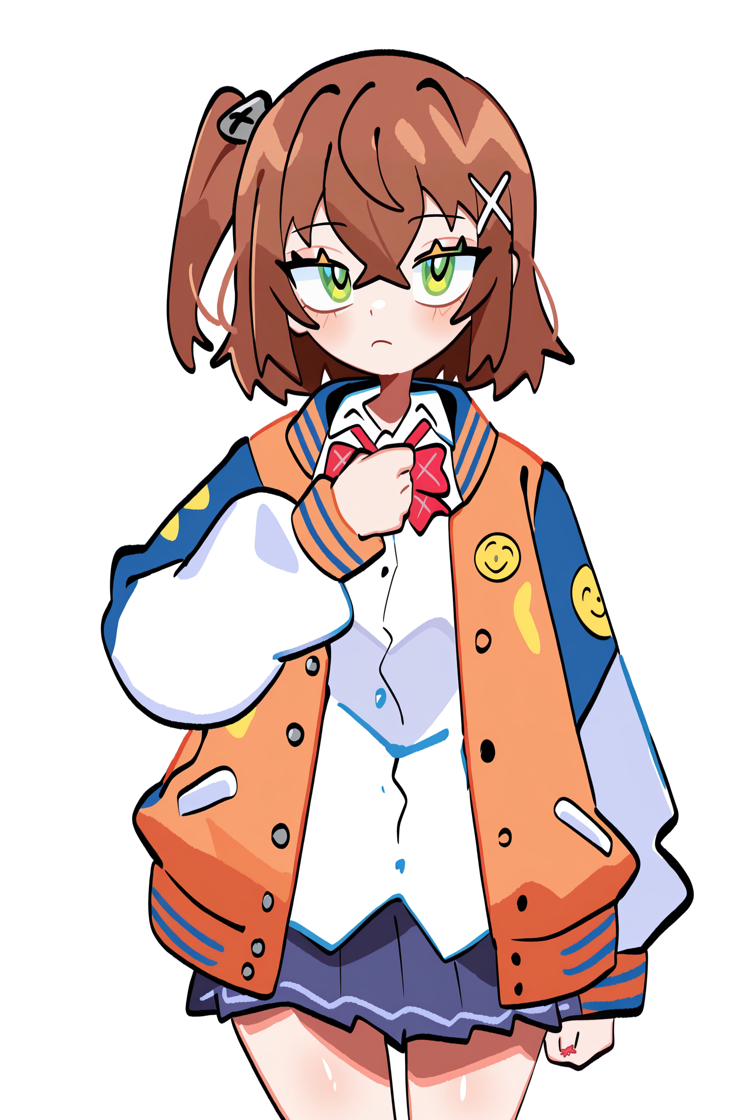 | 학습된 단어 | hidakareina, hair ornament, shirt, green eyes, white shirt, brown hair, jacket, bow, red bow, bowtie, one side up, x hair ornament, pleated skirt, skirt, red bowtie, hair between eyes, long sleeves, open mouth, smile, collared shirt, bangs, letterman jacket, blue skirt, bolt\(hardware\), smiley face, button badge, loose hair strand,복사됨! loafers, brown shoes, white socks복사됨! |