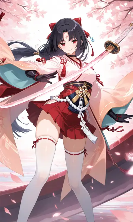 Yotohime, long black hair, low ponytail, red eyes, forehead mark, hair bow, choker, japanese clothes, black long glove, pleated red skirt, skirt slide slits, white thighhighs, red okobo, katana