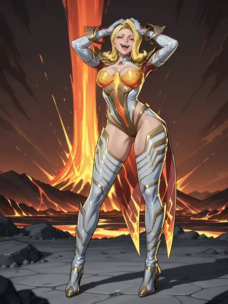 衣装キーワード: ボディスーツ、レオタード、ウエストキャップ、肩アーマー、手袋、太ももブーツ、ハイヒール