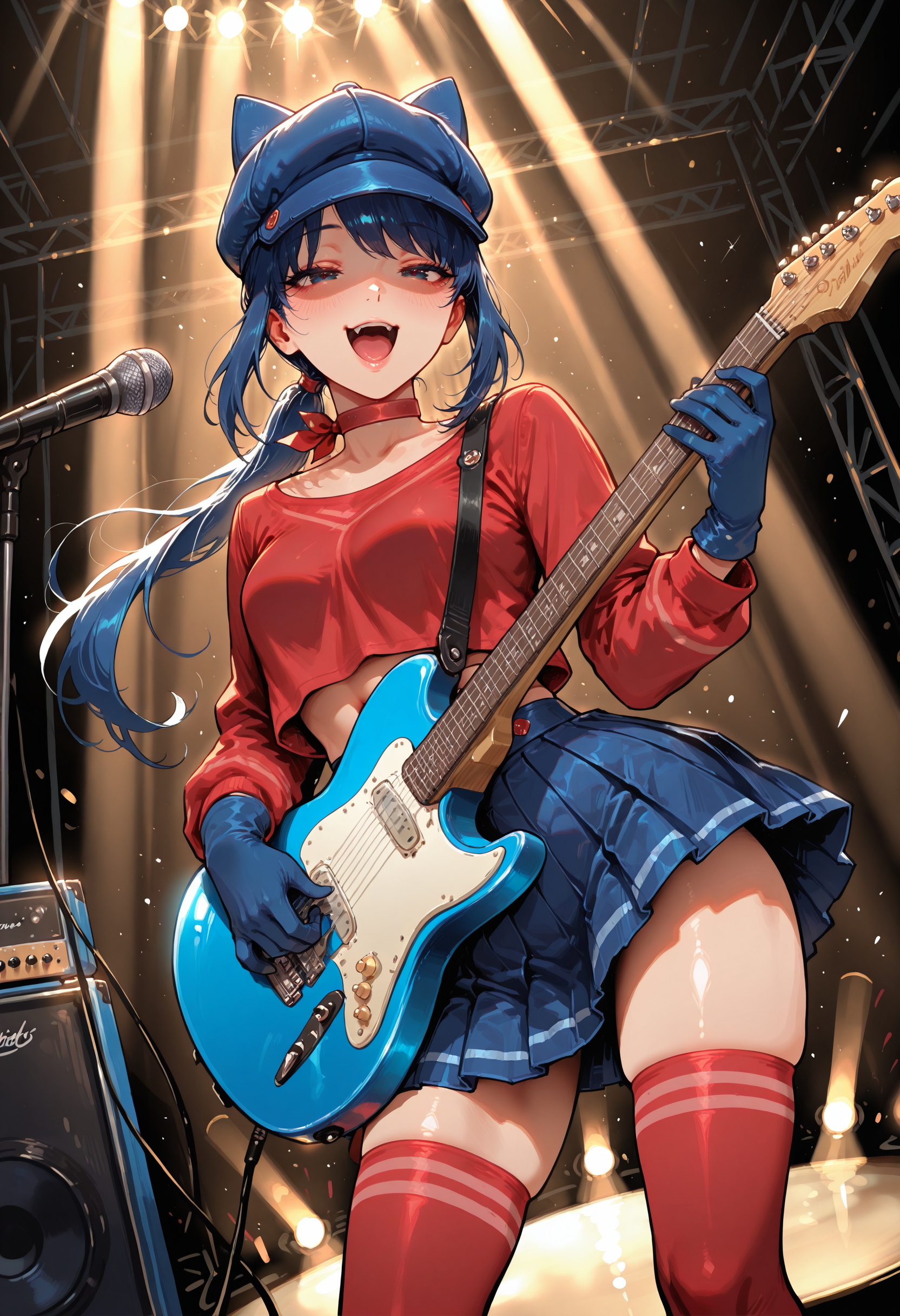 Trigger words: cappiemita, pleated skirt, blue skirt, red shirt, blue hair, midriff, blue gloves, cat hat, red choker, red thighhighs