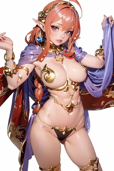 purple transparent shawl,breasts,jewelry,bikini armor,armor,anklet,armlet,barefoot,elf,