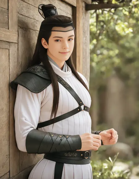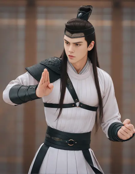 yulexuanblk, 百褶裙, 写实风格, 汉服, 发髻, 长发, 肩甲, 头饰, 发髻, 发辫, 1个男孩, 护臂, 铜扣, 皮带, 皮带扣, 刘海,