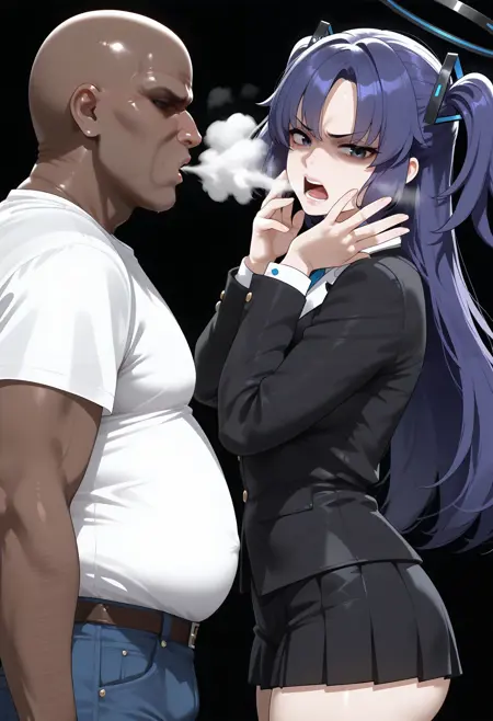 smktnthr, blow smoke at someone, blow smoke to another, smoke, smoke from mouth, breath, heavy breathing, 1boy, fat man, faceless male, bald, ugly male, cowboy shot, dark-skinned male, black background, from side