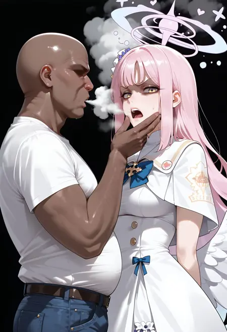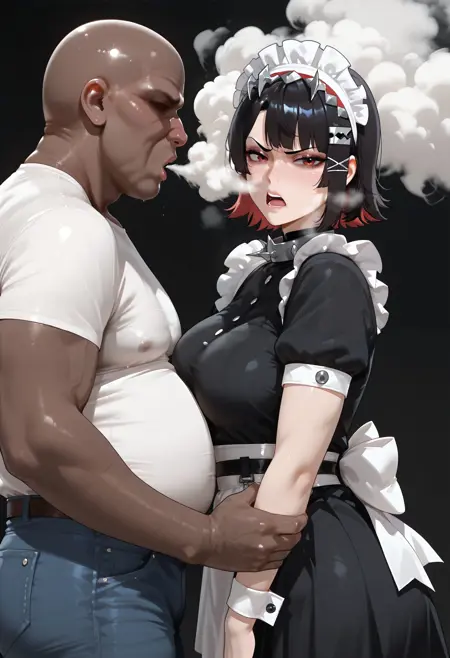 smktnthr, smoke, looking at viewer, fog, black background, cowboy shot, disgust, frown, Inhale smoke, breathing smoke, steam, heavy breathing, open mouth, smoke from mouth, open hand, hands up, resisting, <lora:smoke_to_another_illustrious:0.5>