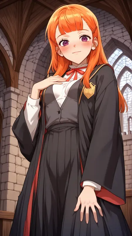 外見: 1girl, 長い髪, オレンジ色の髪, 前髪, 突き出た前髪, 紫の目,