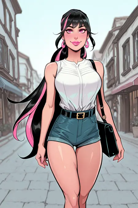 トリガー カジュアル3:HuijinPark、非常に長い髪、黒髪、ピンク髪、多色髪、ピンクの目、頬の赤み、白シャツ、ポニーテール、サイドロックス、イヤリング、短いショートパンツ、ノースリーブシャツ、黒ベルト、デニムショートパンツ、ハンドバッグ、シャツをイン、ハイウエストショートパンツ