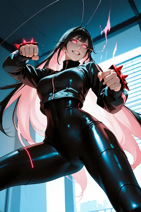 トリガー バトルスーツ:HuijinPark、非常に長い髪、黒髪、ピンクの内毛、ピンクの目、黒ジャケット、クロップジャケット、タートルネック、黒ボディスーツ、アンテナ、節足動物ガール