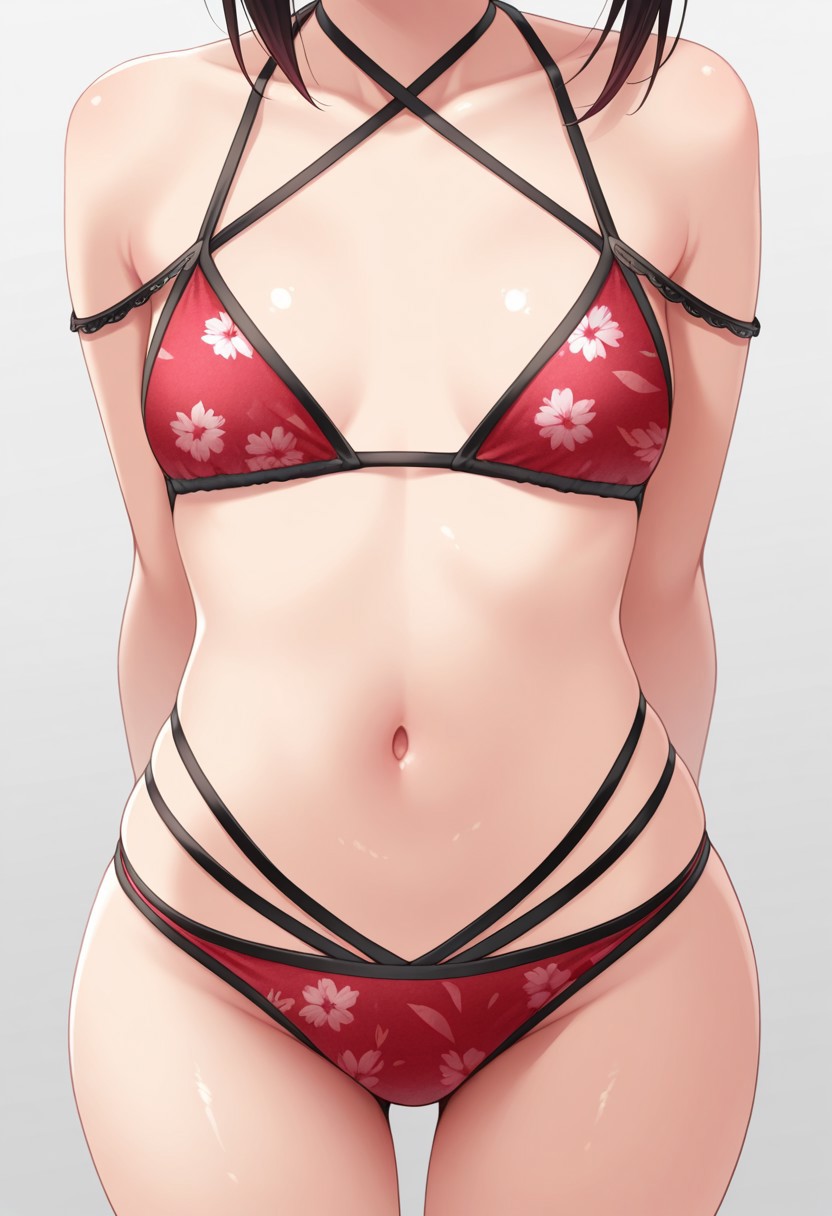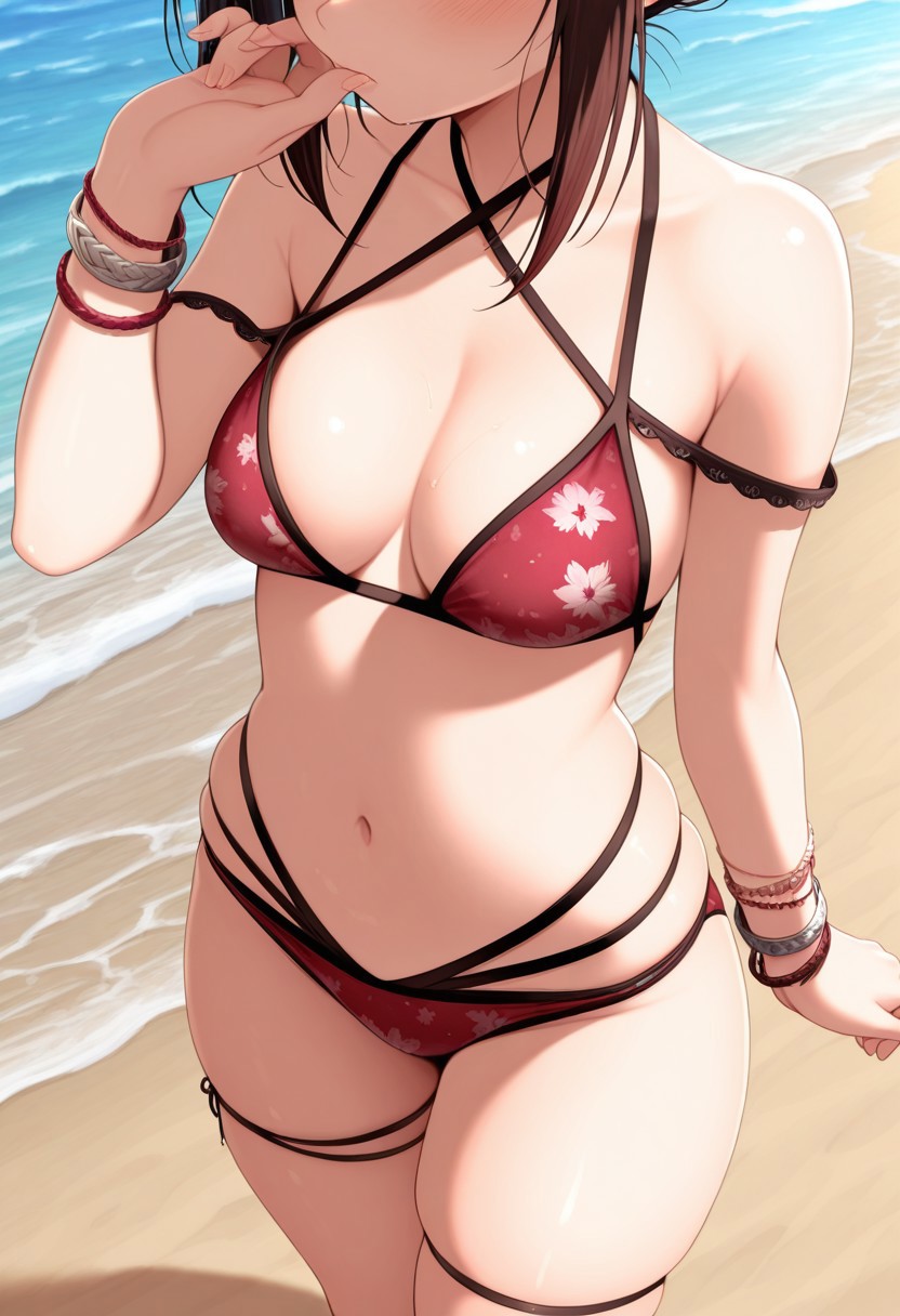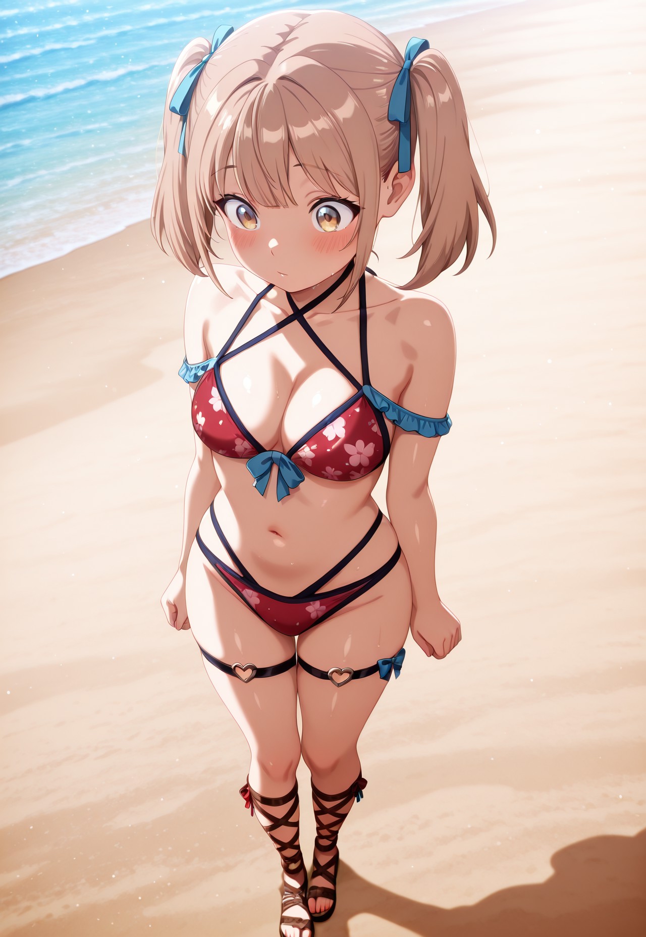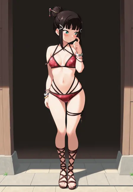 In any case, the unique trigger is "diakini". Strengthen it with "red bikini, print bikini, multi-strapped bikini" – If you really want to go ham on it, there's possibly several more, go to the Danbooru link above to see them all. The original design also comes with a "thigh strap" and "j_ewelry, bracelet, sandals, cross-laced footwear_", you might have to put these in the negative if you don't want them or in the positives to guarantee them. And of course, there's the official Booru tag "kurosawa dia \(dengeki g's poster swimsuit\)", but that doesn't do a lot for the bikini on its own (hence this LoRA) and also obviously implies a lot of Dia, which may or may not be what you want.