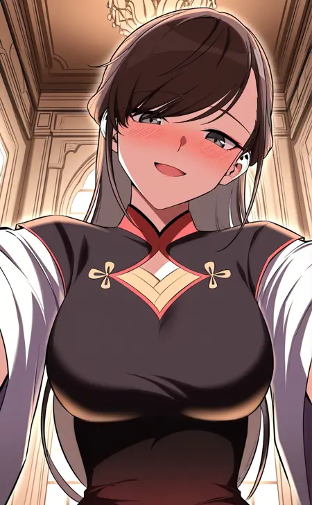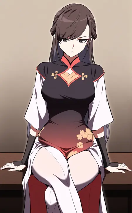 Yuhua_outfit, black and red qipao dress, gradient qipao, floral pattern, high slit dress, mandarin collar, wide white sleeves, black arm warmers, white shoes,