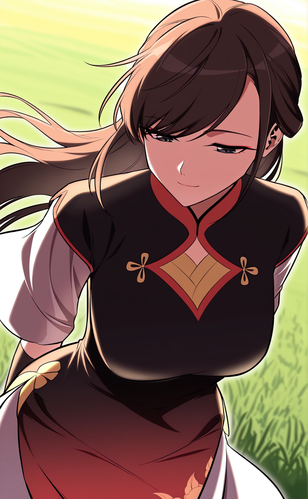 Yuhua, 1 girl, solo, black eyes, long hair, brown hair, straight hair, side swept bangs, long bangs, sidelock, hair ornament,